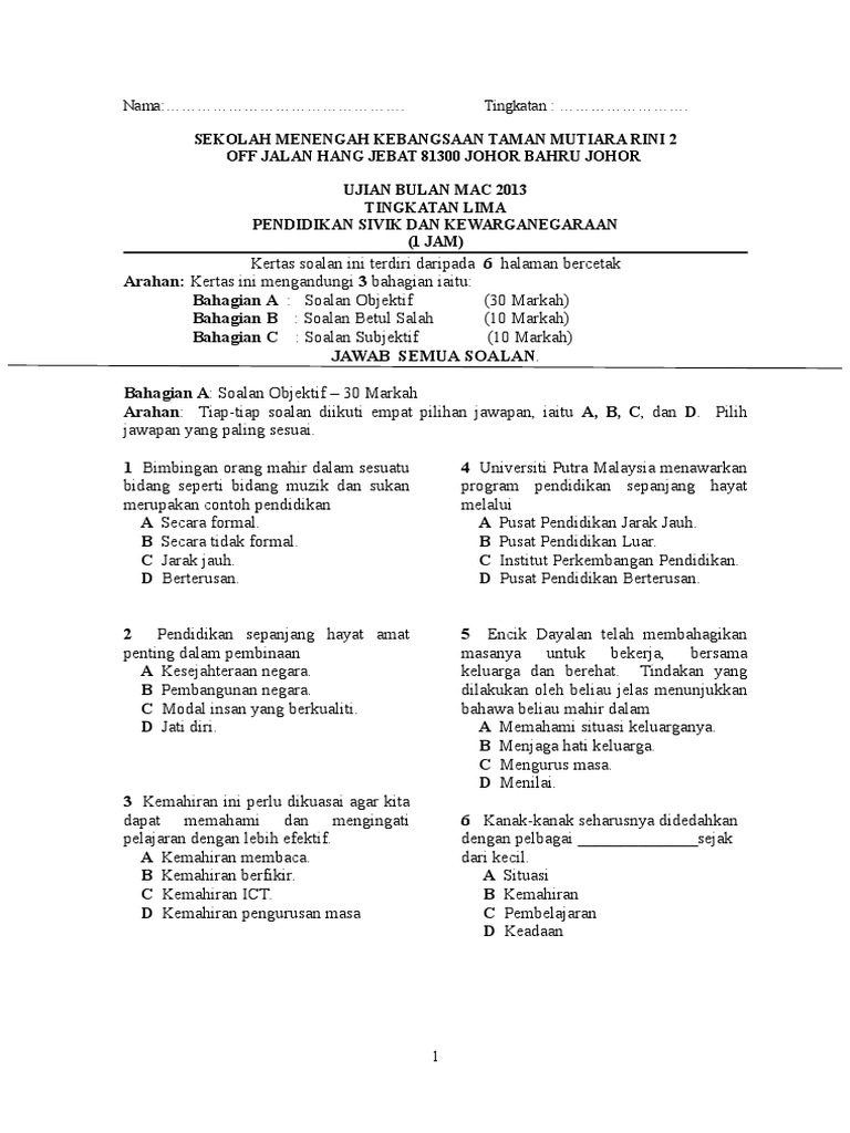 Kertas Soalan Sivik Tingkatan 5 Ujian Mac 2013 Pdf